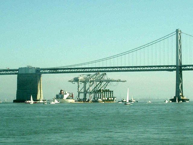 The ship had arrived outside the Gate on Wednesday but had to wait because the weather was not calm enough for the crew to lower the booms as low as they could go. Calm waters were also needed before the ship could come in under the Golden Gate Bridge (estimated clearance after the cranes had been folded down something like 22') and then -- more carefully -- under the Bay Bridge (estimated clearance 5').