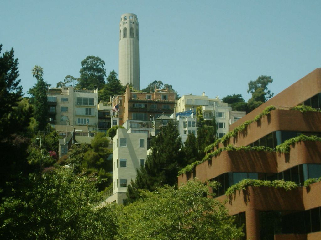The brick building in the right front of the picture is part of the Levi Strauss & Co. campus. The off-white building just visible behind it is the Pearson Addison-Wesley and Benjamin Cummings building on Filbert, just below the Steps.